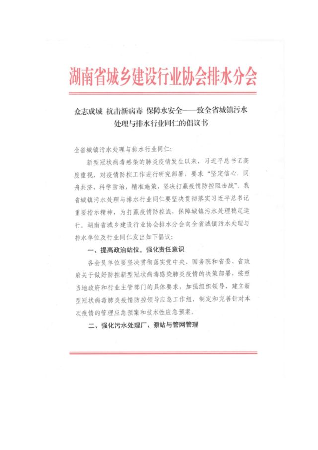 湖南省:眾志成城抗擊新病毒保障水安全——致全省城鎮污水處理與排水行業同仁的倡議書